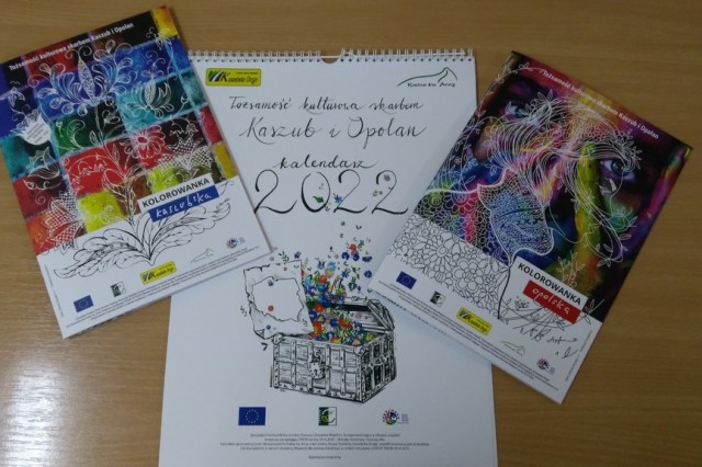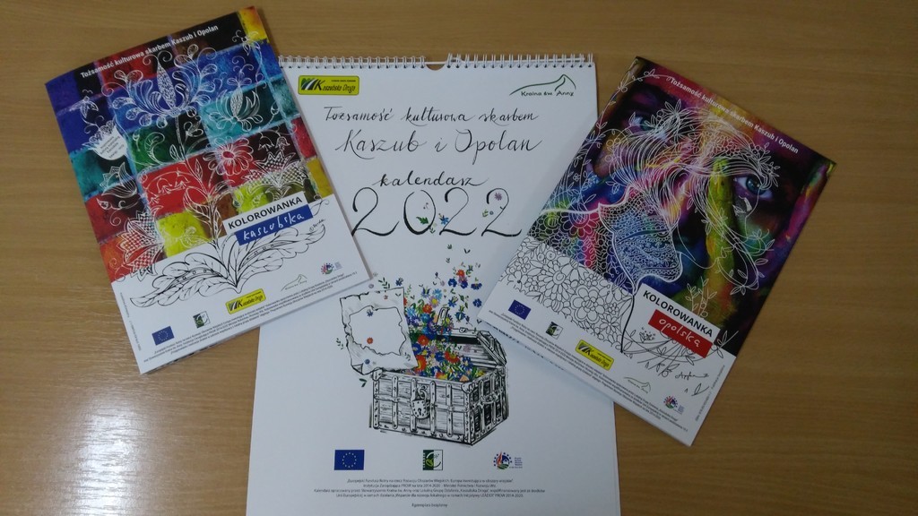 Z radością informujemy, iż w ramach umowy zawartej w dniu 28.12.2020 r. o przyznaniu pomocy w ramach poddziałania 19.3 „Przygotowanie i realizacja działań w zakresie współpracy z lokalną grupą działania” objętego Programem Rozwoju Obszarów Wiejskich na lata 2014-2020 dla operacji pod tytułem: „Tożsamość kulturowa skarbem Kaszub i Opolan” wykonano kalendarz ścienny na przyszły rok oraz kolorowankę z wzorami haftu kaszubskiego w towarzystwie wzorów opolskich. Innowacyjna, oryginalna i niepowtarzalna publikacja kolorowanki składa się z dwóch okładek. Po jednej stronie książki znajduje się kolorowanka kaszubska, po drugiej zaś „do góry nogami” kolorowanka opolska. Jedna połowa książki zawiera opis haftu kaszubskiego, jego powstania, szkół, kolorystyki oraz grafiki do kolorowania. Druga połowa książki zawiera charakterystykę wzorów opolskich a także opolskie grafiki do kolorowania. Całość kolorowanki połączona została stroną, którą można obracać do woli tak jak samą publikacją.