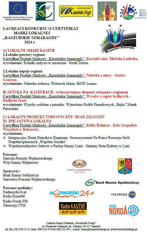 Laureaci Konkursu o Certyfikat Marki Lokalnej "Kaszubskie Szmaragdy" 2014