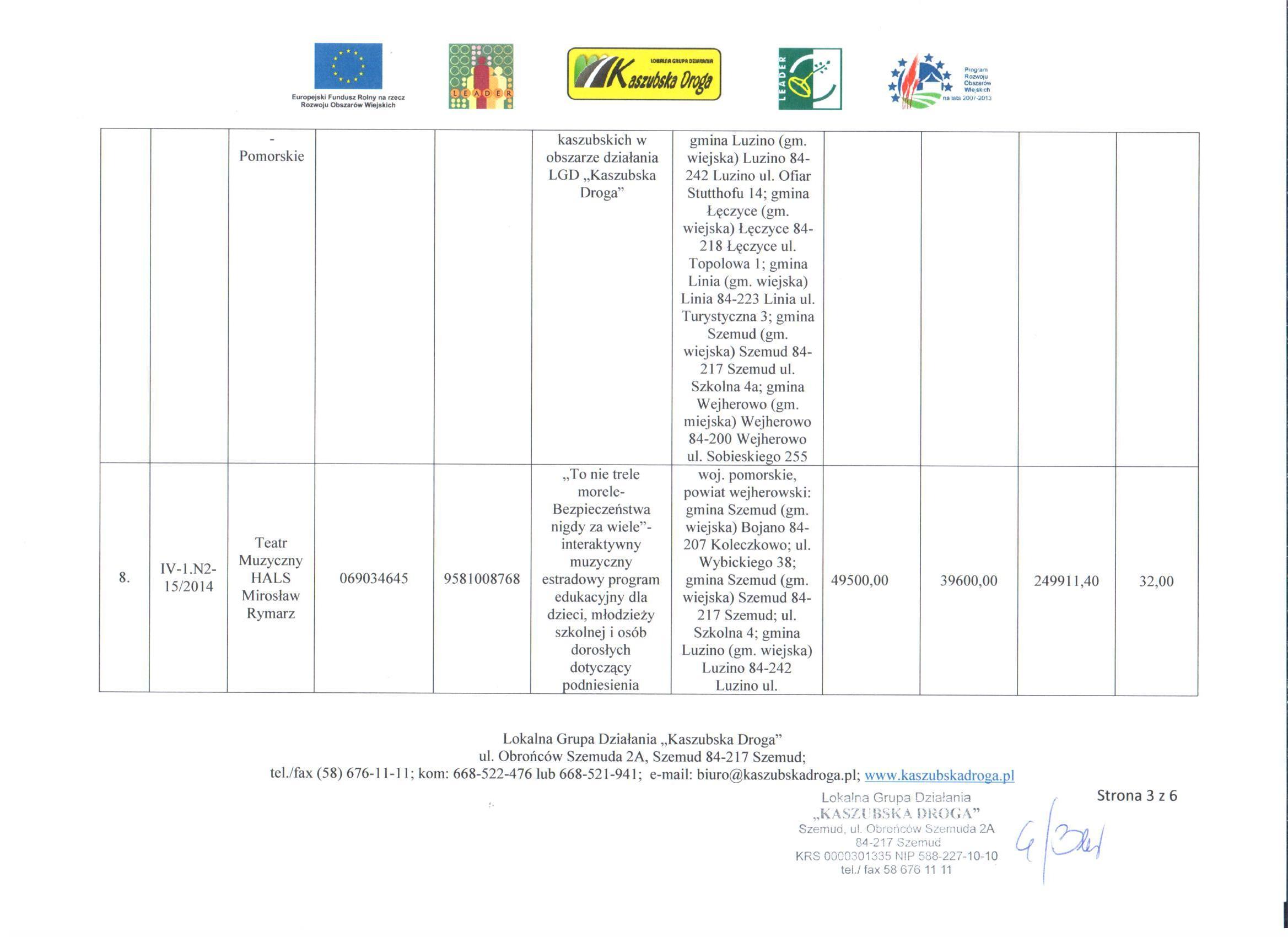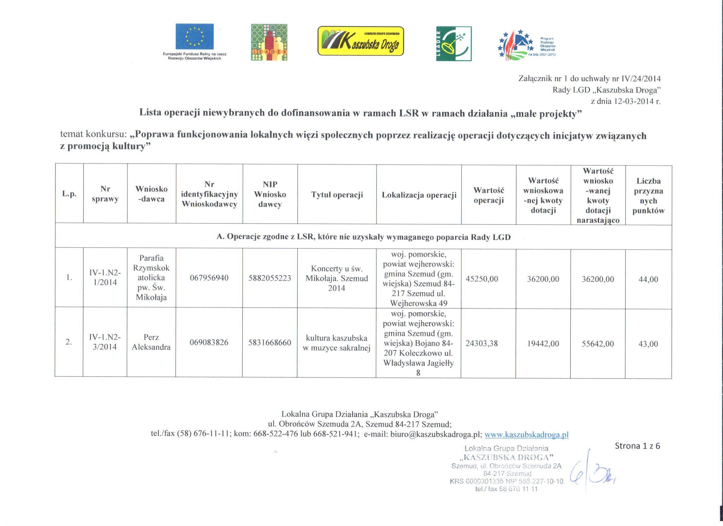 Dnia 12 marca 2014r. Rada LGD "Kaszubska Droga" podjęła uchwały w sprawie  wybrania i niewybrania do dofinansowania projektów ocenionych w ramach  naboru do  konkursu tematycznych ogłoszonego w  dniu 2 stycznia 2014r. związanego z wdrażaniem Lokalnej Strategii  Rozwoju dla działania "małe projekty"