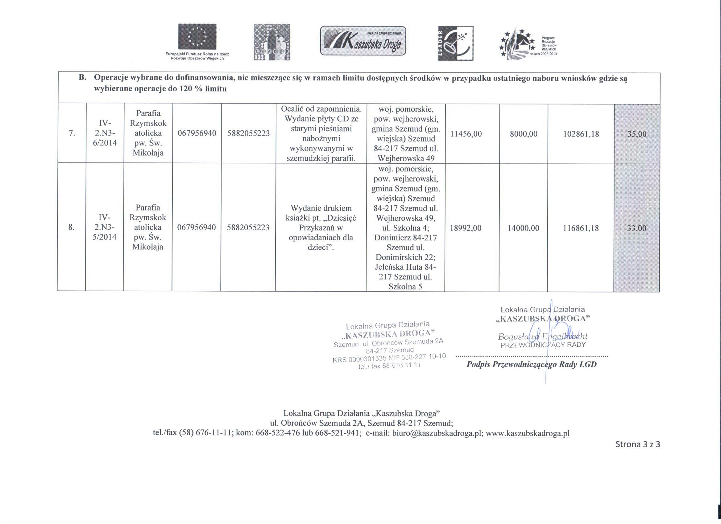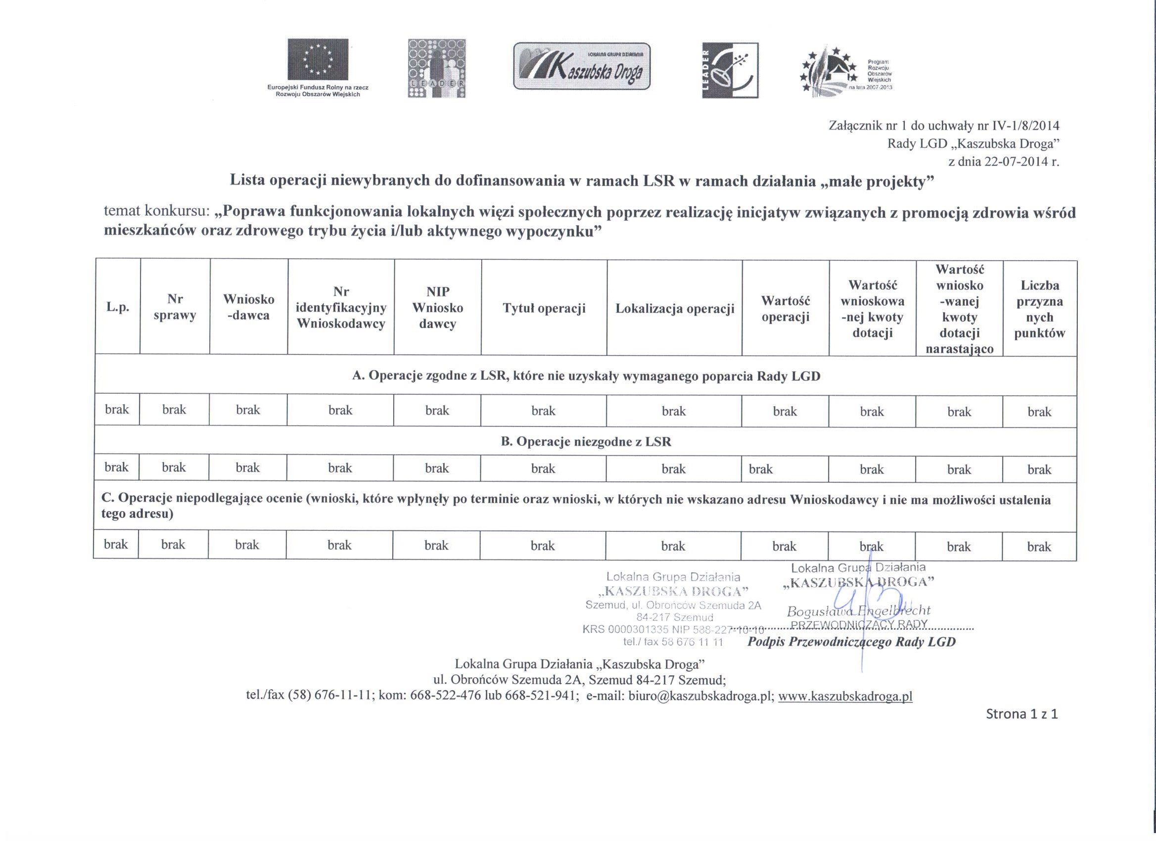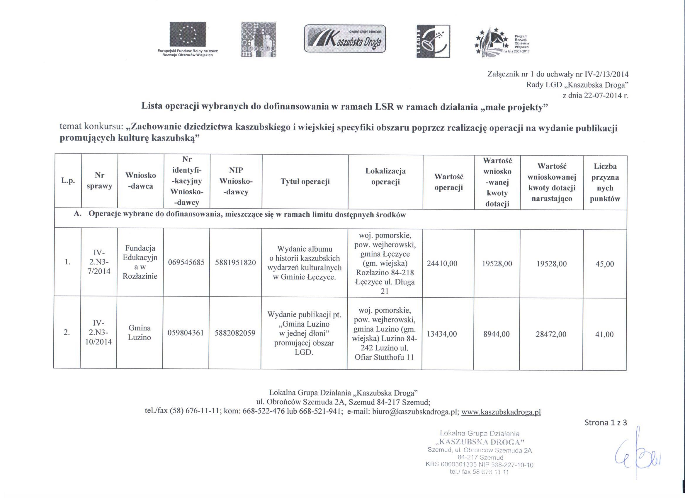 Dnia 22 lipca 2014r. Rada LGD "Kaszubska Droga" podjęła uchwały w sprawie  wybrania i niewybrania do dofinansowania projektów ocenionych w ramach  naboru do  konkursów tematycznych ogłoszonych w dniu 10 czerwca 2014r., związanych z wdrażaniem Lokalnej Strategii  Rozwoju dla działania "małe projekty"