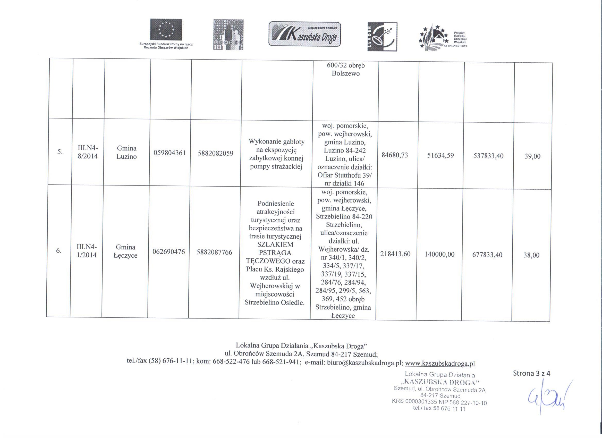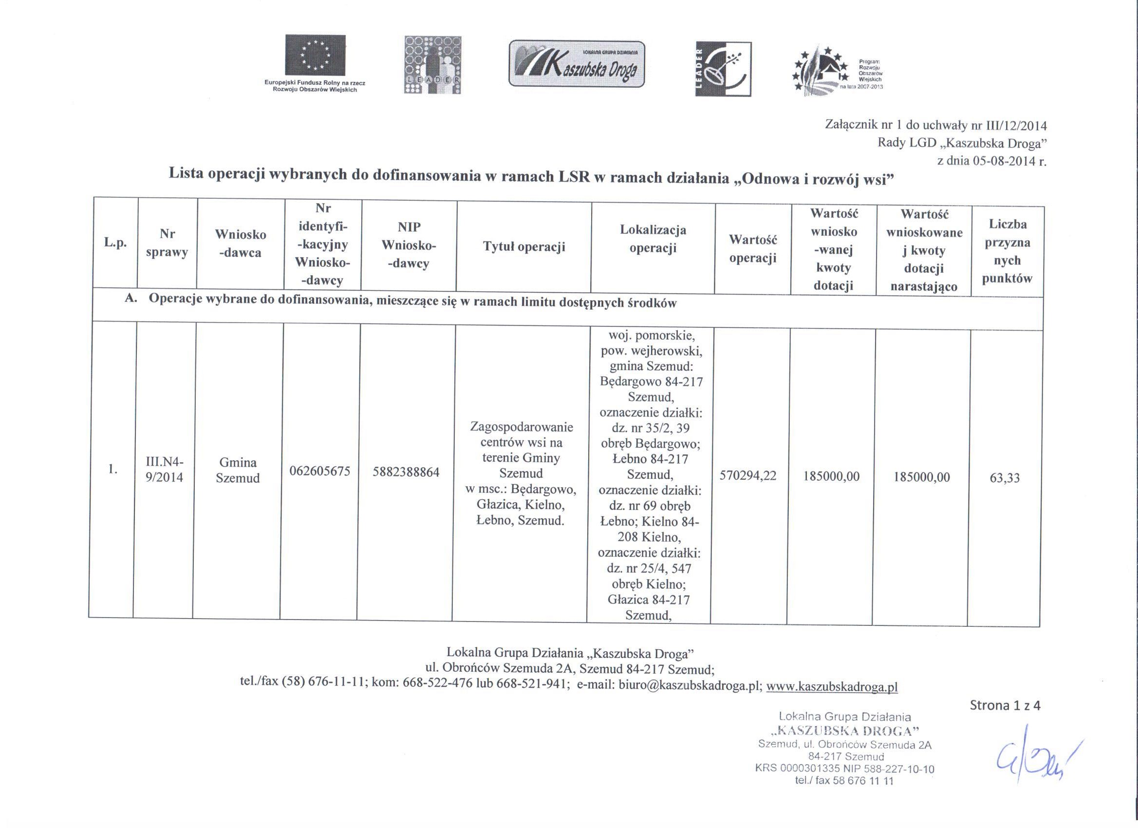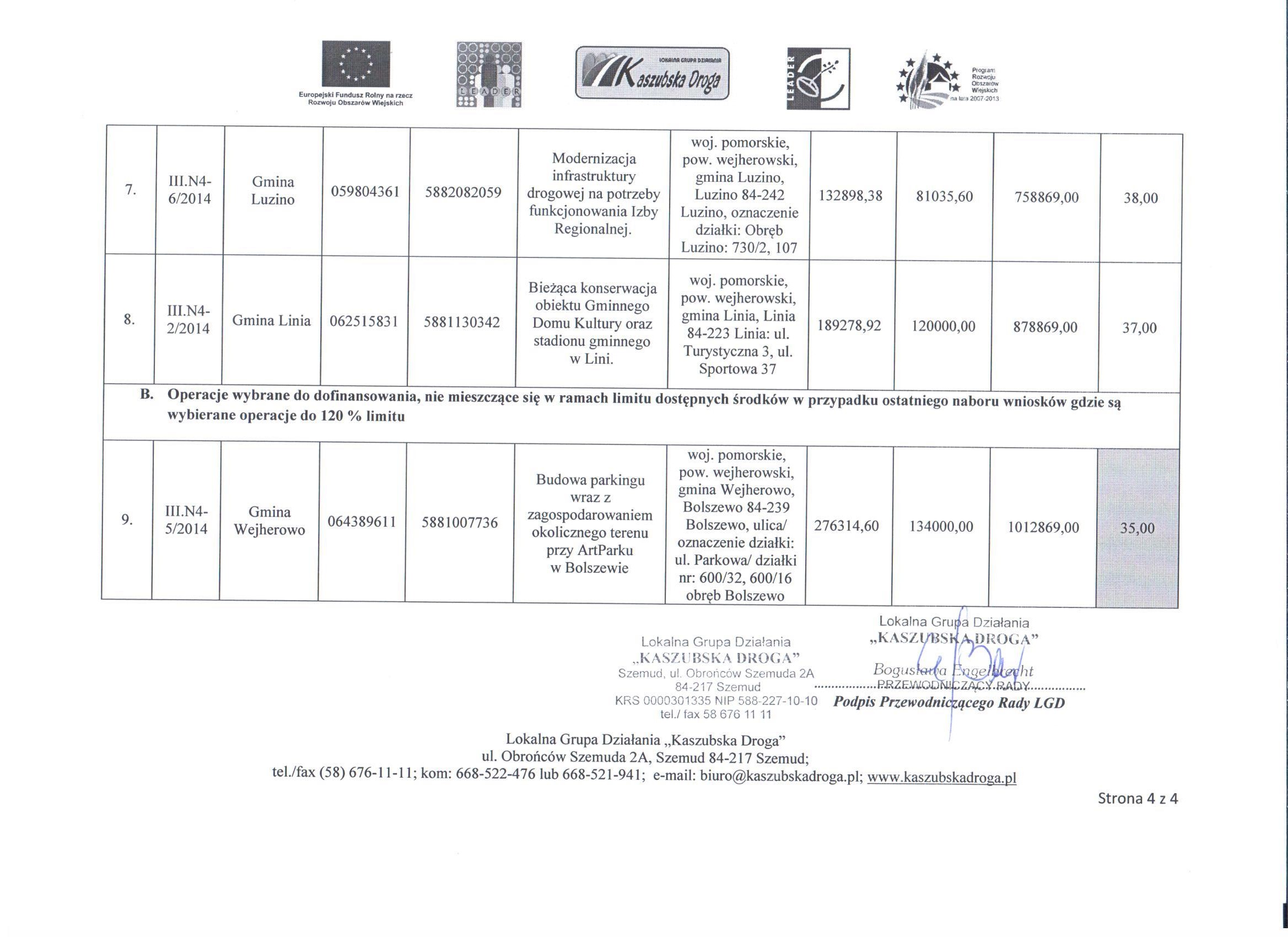Dnia 5 sierpnia 2014r. Rada LGD "Kaszubska Droga" podjęła uchwały w sprawie wybrania i niewybrania do dofinansowania projektów ocenionych w ramach naboru do konkursów ogłoszonych w dniu 30 czerwca 2014r., związanych z wdrażaniem Lokalnej Strategii  Rozwoju dla działania "Odnowa i rozwój wsi"