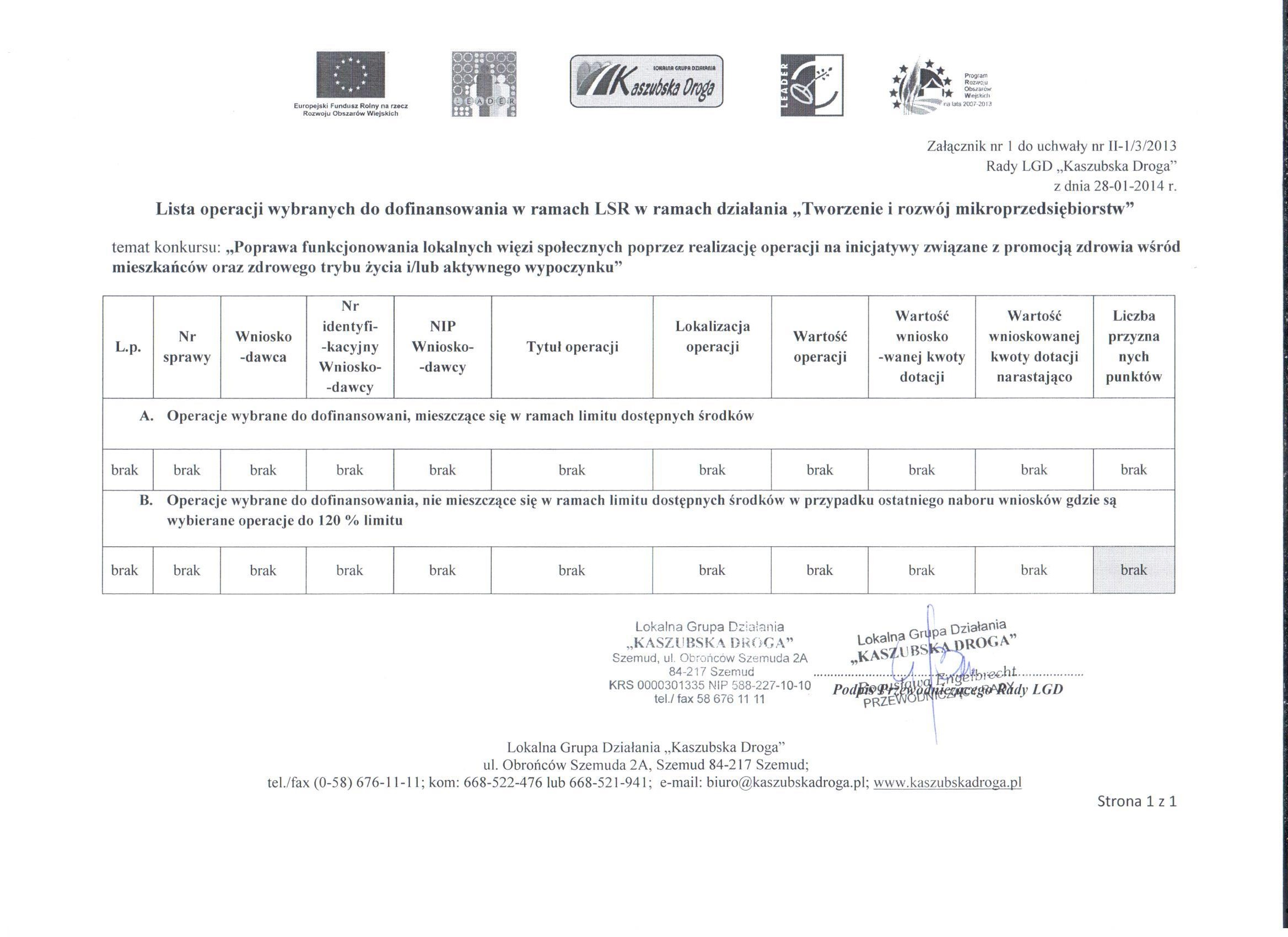 Dnia 28 stycznia 2014r. Rada LGD "Kaszubska Droga" podjęła uchwały w sprawie  wybrania i niewybrania do dofinansowania projektów ocenionych w ramach  naboru do  konkursów tematycznych ogłoszonych w  dniu 17 grudnia 2013r. związanych z wdrażaniem Lokalnej Strategii  Rozwoju dla działania "Tworzenie i rozwój mikroprzedsiębiorstw"