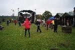 Niestety w dzień imprezy zaskoczyła wszystkich chętnych uczestników paskudna, zimna, deszczowa pogoda co przełożyło się ona na skromniejszą niż planowaliśmy liczbę osób z lokalnej społeczności wychodzących z kijkami na piękne i atrakcyjne trasy. Pogoda jednak nie przeszkodziła w dotarciu na rajd m.in. 17 osobowej grupy gości z Białowieży Starostwo „Hajnówka”. Po ok. godzinnej wędrówce wszyscy uczestnicy dotarli do mety w stanicy Myśliwskiej Wojskowego Koła Łowieckiego „Łoś” nad jeziorem Okuniewo. Tam przywitały uczestników Panie z Kół Gospodyń Wiejskich z miejscowości Głazica, Przetoczyno, Bolszewo, Kniewo, ciepłymi posiłkami złożonymi z tradycyjnych kaszubskich potraw. Kolejną nagrodą dla wytrwałych, pozytywnie nastawionych uczestników, którym brzydka pogoda nie przeszkodziła w zdrowym wypoczynku, były czapeczki z logiem projektu „Pomorskie Parki Nordic Walking” oraz mapniki zawierające wytyczone trasy na terenie dwóch lokalnych grup działania. Rozlosowano również wśród uczestników kijki nordic walking, koszulki i czapeczki z logo Stacja Zdrowie - partnera Polskiej Federacji Nordic Walking, która certyfikowała nasze trasy. Kolejną niespodzianką dla przybyłych gości rajdu było ognisko z możliwością pieczenia przygotowanych kiełbasek. Nie zabrakło dobrej muzyki w wykonaniu zespołu M22 złożonego z leśników z nadleśnictwa Strzebielino oraz rockowej grupy „Timur i jego drużyna”. Przy obu zespołach bawiliśmy się wspaniale mimo rzęsistego deszczu. Nasi goście z Hajnówki wyjechali bardzo zadowoleni zapraszając nas w podziękowaniu w przyszłym roku na podobny rajd Nordic Walking po trasach wytyczonych przez LGD „Kraina puszczy i żubra” w Puszczy Białowieskiej.
