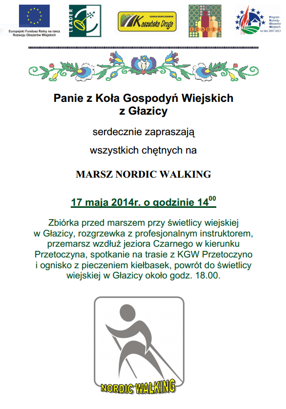 Zbiórka przed marszem przy świetlicy wiejskiej w Głazicy, rozgrzewka z profesjonalnym instruktorem, przemarsz wzdłuż jeziora Czarnego w kierunku Przetoczyna, spotkanie na trasie z KGW Przetoczyno i ognisko z pieczeniem kiełbasek, powrót do świetlicy wiejskiej w Głazicy około godz. 18.00.